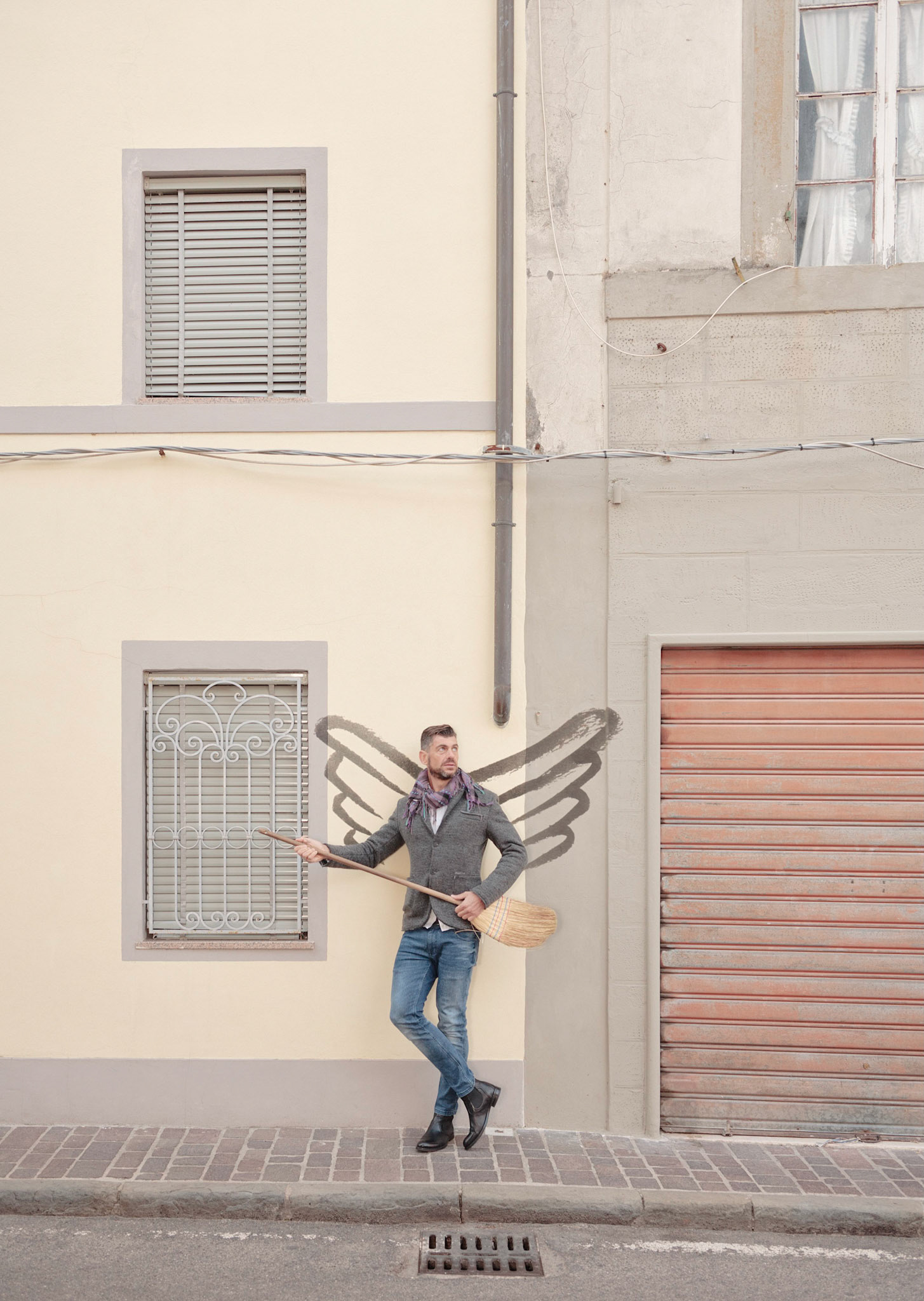 the same woman pops out of a hole in an imaginary wall and looks around at her doubles